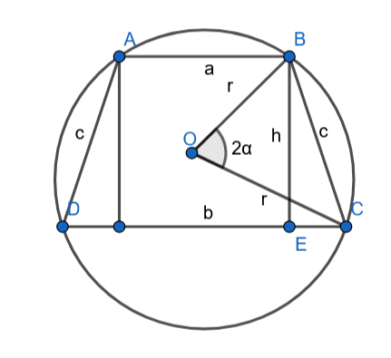 Udowodnij, że pole tego trapezu wyraża się wzorem , jeśli w okrąg wpisano trapez o wysokości . Kąt między promieniami okręgu poprowadzonymi do końców jednego z ramion trapezu jest równy .