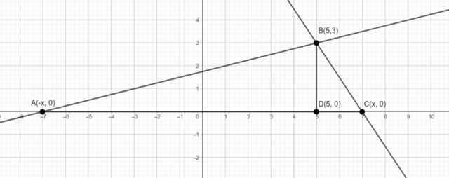 Prosta reprezentuje wykres funkcji malejącej , a prosta m reprezentuje wykres funkcji rosnącej . Zarówno funkcja f, jak i g, przyjmują wartość 3 dla argumentu 5. Ponadto przyjmują wartość 0 dla przeciwnych argumentów. Pole trójkąta ograniczonego przez proste k, m i oś OX wynosi 21. Podaj współczynniki kierunkowe prostych k i m.