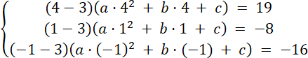 jest pierwiastkiem. Następnie skorzystaj z danych punktów i rozwiąż układ równań. Wyznacz a, b i c. Zapisz wzór funkcji