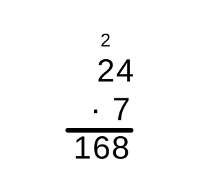 Policz liczbę kartek potrzebną na wydrukowanie 24 kompletów przez pomnożenie 24 przez 7, ponieważ tyle kartek ma jeden komplet, a następnie odejmij od otrzymanego wyniku 150, by dostać liczbę kartek, jaką należy dołożyć, by można było wydrukować 24 komplety. Wykonując mnożenie pisemne przez liczbę jednocyfrową, należy najpierw pomnożyć liczbę jednocyfrową, przez cyfrę jedności większej liczby. Jeśli otrzymana liczba jest dwucyfrowa, należy cyfrę jedności takiego wyniku zapisać pod słupkiem cyfr jedności, a cyfrę dziesiątek z wyniku trzeba przenieść dalej poprzez dopisanie tej cyfry nad kolejnym w lewo słupkiem, czyli słupkiem cyfr dziesiątek. Przy mnożeniu kolejnego słupka, do wyniku dodaje się przeniesioną cyfrę ze słupka wcześniej. W taki sam sposób należy mnożyć każdą kolejną cyfrę większej z liczb zaczynając od lewej i idąc do prawej. Jeśli w ostatnim słupku wyjdzie liczba większa od 10, to już nie wolno przenosić dalej, bo nie ma kolejnego słupka, lecz należy napisać całą liczbę.
