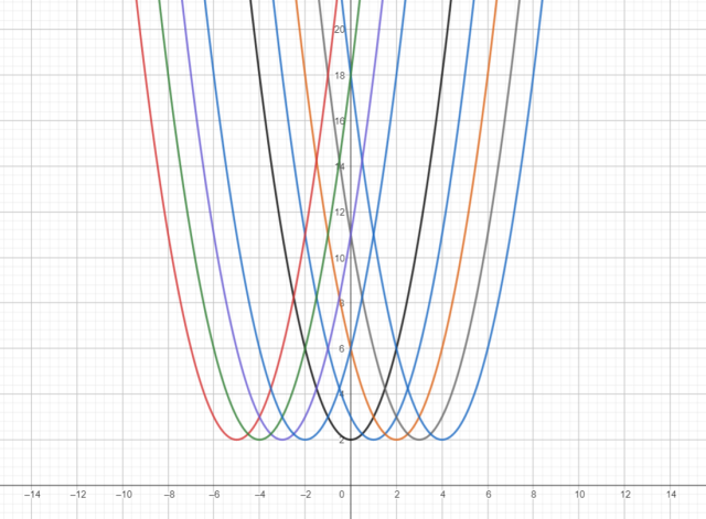 Można zauważyć, że dla wykresy kolejnych paraboli pokryją całą płaszczyznę nad prostą parabole z rodziny stworzą półpłaszczyznę.