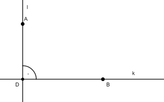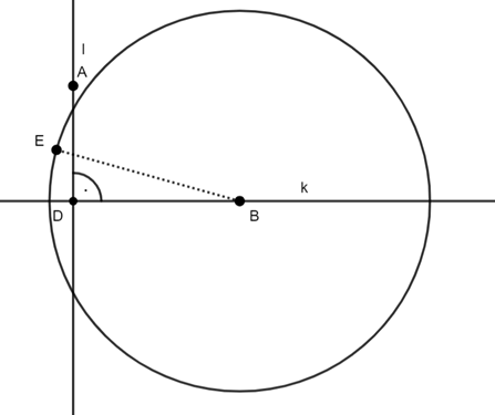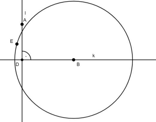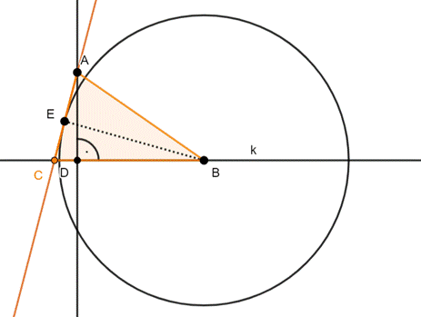 W tym zadaniu najpierw skonstruuj dwie proste prostopadłe k i l, a punkt ich przecięcia oznacz literka I. Następnie zaznacz na prostej l, punkt A, a na prostej k, punkt B. Z punktu B narysuj okrąg o dowolnym promieniu, niech okrąg przechodzi przez prostą k i l i narysuj styczną do okręgu w punkcie E i przechodzącą przez punt A. Punkt przecięcia prostej k ze styczną oznacz literką C, a na koniec połącz punkty ABC.