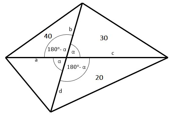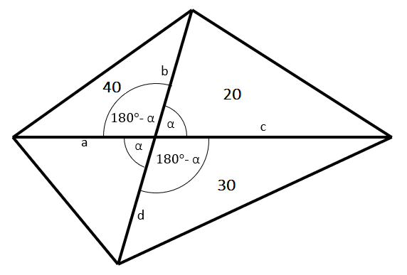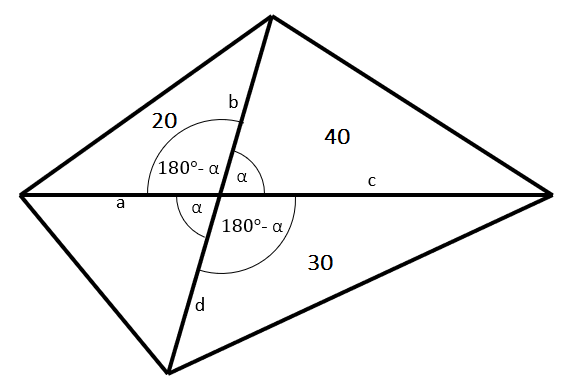 Rozwiązanie zadania należy podzielić na trzy przypadki, w zależności od tego, w jakiej kolejności ułożone są znane pola trójkątów. Każdy przypadek rozwiąż analogicznie.