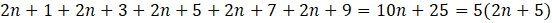 Udowodnij, że suma pięciu kolejnych liczb, będącymi liczbami naturalnymi i nieparzystymi, jest liczbą naturalną, z cyfrą jedności 5