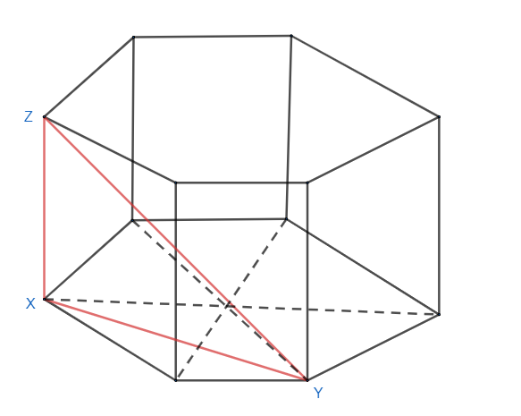W przedstawionym na załączonym rysunku graniastosłupie prawidłowym sześciokątnym wszystkie krawędzie mają jednakową długość. Podaj miary kątów ostrych w trójkącie prostokątnym XYZ.