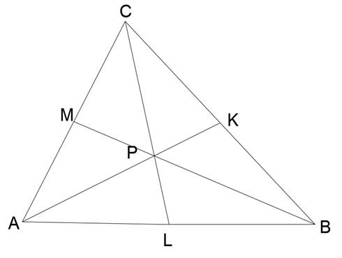 Dany jest trójkąt ABC, środkowe trójkąta AK i CL przecinają się w punkcie P. Jaki jest stosunek pól trójkątów ABC i PLK?