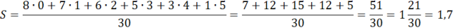 Średnia arytmetyczna to 1,7, a mediana wynosi 1,5.