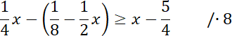 Wyznacz rozwiązania każdej z podanych nierówności, aby to zrobić całą pierwszą nierówność pomnóż przez najmniejszą wspólną wielokrotność liczb znajdujących się w mianownikach ułamków, przenieś wszystkie liczby z
