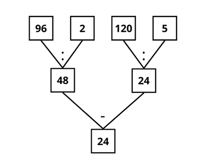 Na górze grafu wypisz wszystkie liczby znajdujące się w wykonywanym działaniu. Wykonuj działania zgodnie z ich kolejnością, czyli najpierw działanie w nawiasie, później dzielenie/mnożenie i na końcu dodawanie/odejmowanie.