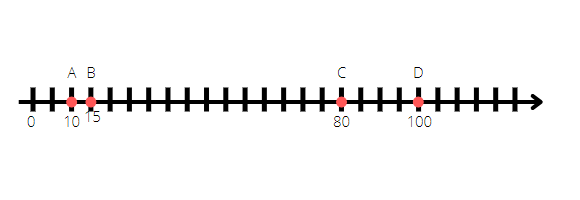 Musisz narysować oś liczbową, następnie dobrać jednostkę i zaznaczyć punkty: A = 10, B = 15, C = 8-, D = 100.