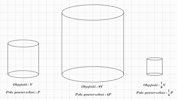 Bryły narysuj, znając ich wymiary, które oblicz, wiedząc, że stosunek pól powierzchni brył jest równy skali podobieństwa do kwadratu, a stosunek ich objętości – równy skali do sześcianu.