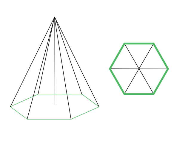 W podstawie ostrosłupa prawidłowego sześciokątnego znajduje się sześciokąt foremny. Rysując dłuższe przekątne tego sześciokąta, dzielimy go na 6 przystających trójkątów równobocznych o boku długości równej długości boku sześciokąta.