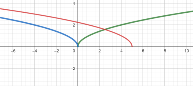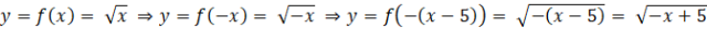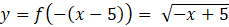 Na początku naszkicuj wykres funkcji f – kolor zielony. Następnie wykonaj odbicie wykresu względem osi OY – kolor niebieski. Na koniec otrzymany wykres przesuń o wektor [5, 0] – kolor czerwony.