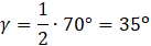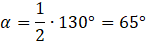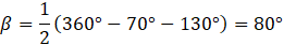 Kąty α i γ oparte są na tych samych łukach co kąty środkowe o podanych w treści miarach (130° i 70°), zatem ich miary są dwukrotnie mniejsze od miar kątów środkowych. Kąt β oparty jest na tym samym łuku co kąt środkowy, którego miarę możesz obliczyć przez odjęcie od kąta pełnego miar znanych kątów środkowych.