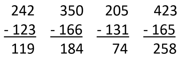 Na początku musisz zapisać pod sobą odpowiednie wartości. Następnie musisz odjąć od siebie liczby znajdujące się w tej samej kolumnie, aby otrzymać wynik, pamiętając, że jeśli od mniejszej liczby odejmujemy większą, wówczas musisz „pożyczyć” wartość dziesiątek z sąsiedniej różnicy (np. jeśli odejmujemy 2 od 3, wówczas trzeba „pożyczyć” wartość dziesiątek, co daje odejmowanie 12 – 3 oraz zmniejszenie liczby, od której została „pożyczona” wartość o 1).