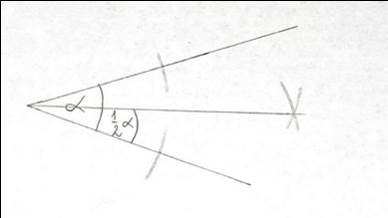 . Przy pomocy cyrkla, zakreśl dwa łuki o równym promieniu na każdym z jego dwóch ramion. Z punktów przecięcia łuków z ramionami kąta, przy pomocy cyrkla, zakreśl dwa łuki o równym promieniu tak, by przecięły się w jednym punkcie, a następnie narysuj prostą przechodzącą przez ten punkt i wierzchołek kąta. Na koniec oznacz powstałe kąty miarą