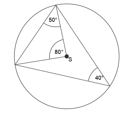 W tym zadaniu wykorzystaj informację, że miara kąta wpisanego w okrąg o środku S jest równa połowie miary kąta środkowego, opartego na tym samym łuku oraz powstały trójkąt o wierzchołku w punkcie S jest równoramienny.