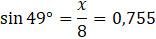 Wylicz długość odcinka x, korzystając z funkcji trygonometrycznych.