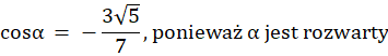 Korzystając z jedynki trygonometrycznej oraz wzoru na tgα obliczasz cosα i tgα, wiedząc, że α jest kątem rozwartym.