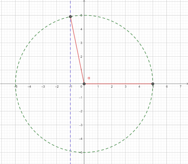Narysuj w układzie współrzędnych prostą x = -1 oraz okrąg o środku S(0;0) o promieniu 5. Przecięcie okręgu z prostą wyznaczy punkt należący do ramienia kąta nachylonego pod kątem α do osi x. Połącz ten punkt z początkiem układu współrzędnych.