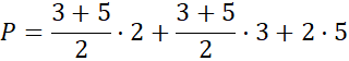 Zauważ, że wielokąt podzielono na dwa trapezy i prostokąt. Pole jednego z trapezów już wpisano, dopisz pole drugiego (o podstawach równych 3 i 5 i wysokości wynoszącej 3) i pole prostokąta. Powierzchnia trapezu to połowa iloczynu wysokości i sumy podstaw, a powierzchnię prostokąta przedstawisz, mnożąc przez siebie jego długość i szerokość.