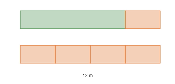 Wiemy, że suma długości długiego i krótkiego chodnika to 12 m. Dłuższy chodnik jest 3 razy większy od krótszego, więc można go podzielić na 3 fragmenty, każdy o długości krótszego chodnika – po takim podziale zarówno wymiary chodników, jak i łączna długość się nie zmienią.