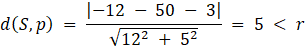 Środek okręgu znajduje się w odległości mniejszej od promienia okręgu od prostej, mają zatem dwa punkty wspólne, czyli prosta p jest sieczną okręgu O.