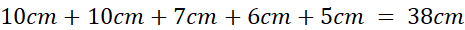 Teraz trzeba dodać długości wszystkich boków, aby obliczyć obwód. AB = 3 cm, BC = 7 cm, CE = 10 cm, EF = 7 cm, FG = 6 cm, AG = 5 cm.