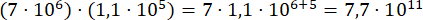 Pomnóż liczby zapisane w notacji wykładniczej: wymnóż pierwszy czynnik z jednej liczy przez pierwszy czynnik drugiej liczby. To samo zrób z drugimi czynnikami liczb – pamiętaj, że mnożąc potęgi o tych samych podstawach, musisz dodać do siebie wykładniki, a podstawy pozostają bez zmian. Wynik zapisz w postaci notacji wykładniczej.