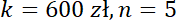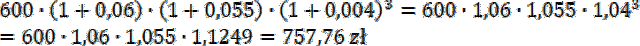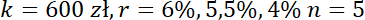 Oblicz kapitał, który znajdzie się po 5 latach na koncie oprocentowanym w pierwszym roku na 6% w drugim na 5,5%, a później na 4%, jeśli zostanie na niego wpłacone 600 zł.