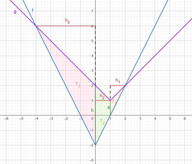 Następnie zaznacz obszar ograniczony powstałym wykresami. Zauważ, że powstały dwa trójkąty i trapez. Zaznacz podstawę oraz opadającą na nią wysokość w każdym z nich i oblicz sumę ich pól.