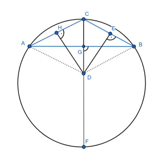 W tym zadaniu zauważ, że promień okręgu o środku D, jest symetralną odcinków trójkąta ABC. Wyznacz odległości, korzystając z twierdzenia Pitagorasa.