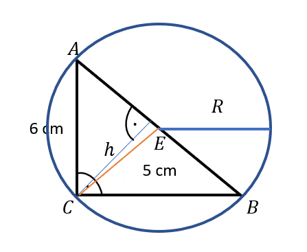 Skorzystaj z zależności na okrąg opisany na trójkącie prostokątnym–na tej podstawie wyznacz wartość przeciwprostokątnej trójkąta ABC. Następnie z twierdzenia Pitagorasa, oblicz długość boku |CB| i zauważ, że pole trójkąta można wyznaczyć w tym zadaniu na 2 sposoby, więc przyrównaj te pola i wyznacz długość wysokości poprowadzonej na przeciwprostokątną |AB|.