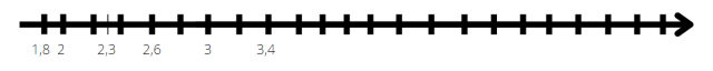 Widać, że między punktami 1,8 i 2 jest 0,2 różnicy odległości. Z każdą następną kreseczką będzie tak samo. Odliczaj kreseczki, aż do wyniku 3,4. Uważaj 2,3 będzie pośrodku dwóch kreseczek.