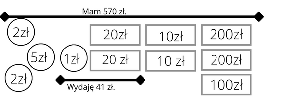 Musisz naszkicować banknoty i monety, aby zilustrować podane działanie 570 – 41.