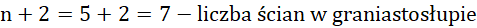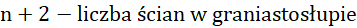 Przyjmij, że n to jest liczba boków figury będącej podstawą graniastosłupa. Wtedy liczbę wszystkich wierzchołków w graniastosłupie, które znajdują się w podstawach bryły, obliczasz, mnożąc wierzchołki jednej podstawy razy 2. Aby obliczyć liczbę ścian w bryle, obliczasz, dodając do dwóch podstaw ilość krawędzi jednej podstawy.