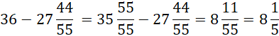 W pierwszej kolejności zamień jedną całość na ułamek. Pozostałe całości pozostawiasz bez zmian. Pamiętaj, że dalej całości odejmujesz od całości, a ułamki od ułamków. Gdy odejmujesz ułamki o jednakowych mianownikach, musisz odjąć od siebie liczebniki, a mianownik pozostawić bez zmian.