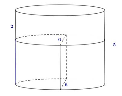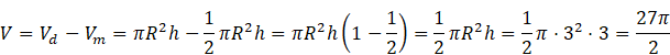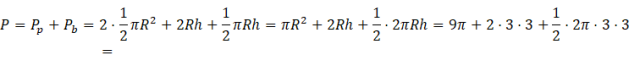Objętość dorysowanej bryły (V) oblicz jako połowę objętości dolnego walca o promieniu podstawy R = 3 i wysokości h = 3. Jej pole powierzchni całkowitej (P) jest sumą pola podstaw (Pp) oraz pola bocznego (Pb), które jest sumą pola prostokąta oraz połową powierzchni bocznej dolnego walca.