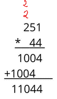 W mnożeniu pisemnym z zerem można usunąć zero z końca i zapisać na końcu ostatecznego wyniku. Liczbę z większą ilością cyfr zapisz na górze, a z mniejszą na dole: 251 ∙ 44 =