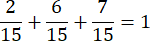 W tym zadaniu musisz wpisać takie liczby, aby suma ułamków wynosiła 1 – jest to możliwe, wtedy gdy, dla takich samych wartości mianowników, suma liczników jest równa liczbie znajdującej się w mianowniku.