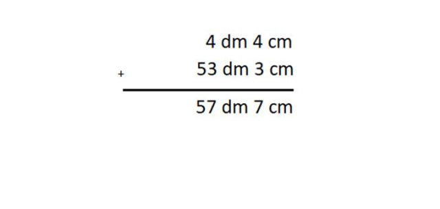 W tym zadaniu musisz wykonać dodawanie: 4 dm 4 cm + 53 dm 3 cm.