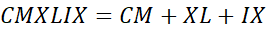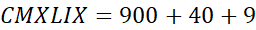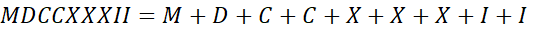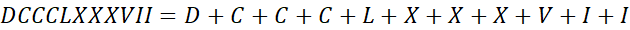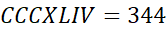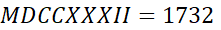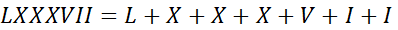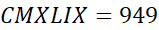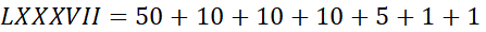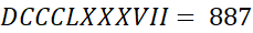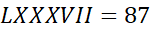 LXXXVII = 87, CLIX = 159, CCCXLIV = 344, CMXLIX = 949, DCCCLXXXVII = 887, MDCCXXXII = 1732