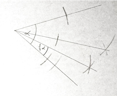 . Przy pomocy cyrkla, zakreśl dwa łuki o równym promieniu na każdym z jego dwóch ramion. Z punktów przecięcia łuków z ramionami kąta, przy pomocy cyrkla, zakreśl dwa łuki o równym promieniu tak, by przecięły się w jednym punkcie, a następnie narysuj prostą przechodzącą przez ten punkt i wierzchołek kąta. Czynność powtórz dla jednego z powstałych kątów o mierze