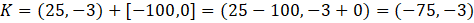Na samym początku musisz utworzyć równanie ze wzoru na długość wektora, następnie podstawić 0 pod współrzędną y, ponieważ wektor jest równoległy do osi OX. Poprawną wartością jest –100, ponieważ zwrot wektora jest skierowany w lewo, co oznacza, że musimy się przesunąć na wykresie o 100 jednostek w lewo, czyli odjąć tę wartość. Na sam koniec musisz dodać wektor W do punktu P (pamiętając, że plus z minusem daje minus), aby otrzymać punkt K znajdujący się na końcu tego wektora