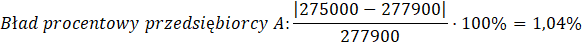 Podaj błąd procentowy i ocenić, który przedsiębiorca popełnił mniejszy błąd.