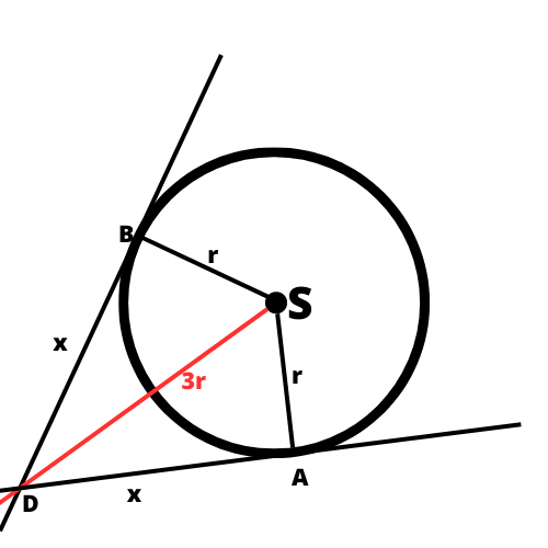 Oblicz obwód czworokąta o wierzchołkach D, A, S, B, wiedząc, że ramiona kąta ADB są styczne do okręgu o środku S w punktach A i B oraz promień okręgu ma długość r i jest trzy razy krótszy od odcinka DS.