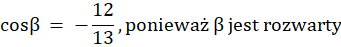 Korzystając z jedynki trygonometrycznej oraz wzoru na tgα obliczasz sinβ i cosβ, wiedząc, że β jest kątem rozwartym.
