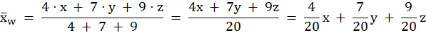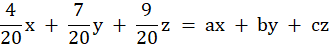 W tym zadaniu musisz znaleźć liczby a, b i c, spełniające równość a + b + c = 1 oraz aby średnia ważona wielkości x, y, z wagami odpowiednio a, b i c była taka sama jak średnia ważona tych wartości z wagami odpowiednio 4, 7, 9.