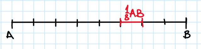 Narysuj odcinek AB i wyznacz jego symetralną. Podziel odcinek na dwie równe części: wbij cyrkiel w jeden koniec odcinka, odłóż odcinek o dowolnej długości. Mając wbity cyrkiel w koniec odcinka, zakreśl łuk, a następnie powtórz tą czynność wbijając cyrkiel w drugi koniec odcinka. Przez punkt przecięcia łuków poprowadź prostą prostopadłą do odcinka – podzieli ona go na dwie równe części. Następnie znajdź symetralne powstałych dwóch odcinków, powtórz ten krok i otrzymasz 8 równych odcinków, jeden z nich to długość szukanego odcinka.