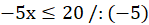 Aby obliczyć nierówność, przenieś wszystkie niewiadome na lewą stronę, a wiadome na prawą stronę. Podczas przenoszenia pamiętaj zmienić znak. Pozbądź się liczby przy x poprzez podzielenie równania przez liczbę znajdującą się przy x. Kiedy w nierówności dzielisz lub mnożysz całą nierówność przez liczbę ujemną, to znak nierówności obróć w drugą stronę. Po obliczeniu nierówności wypisz liczby ujemne całkowite, które spełniają tę nierówność.